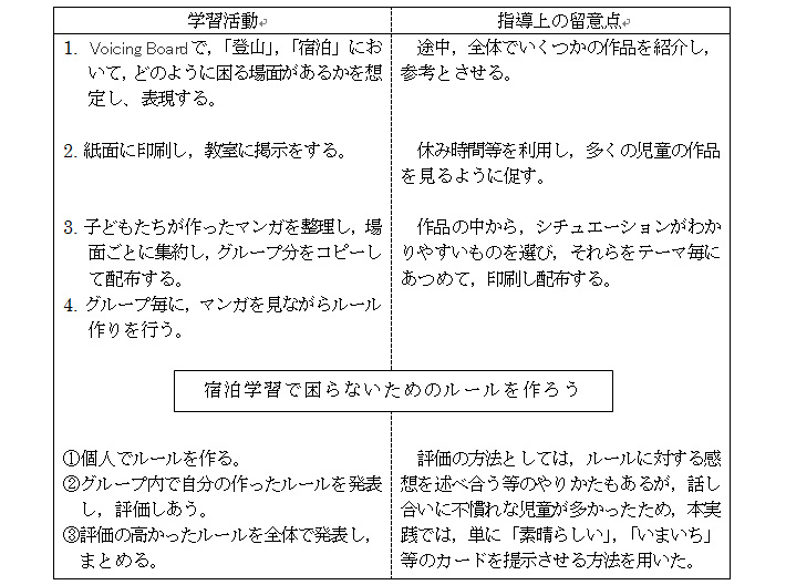 だがルール作りといっても,子どもたちには宿泊学習は初めての体験であるため,容易に作ることはできない。そこでこの本単元では、ルール作りを促進するために,マンガ表現支援システムVoicingBoardを用いて、様々なシチュエーションをマンガで表現させた。