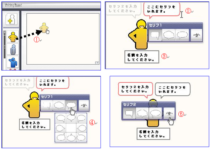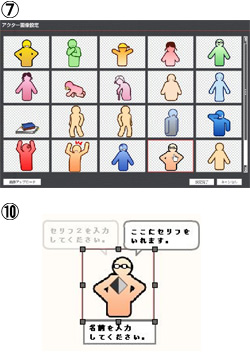 (1) 登場人物(アクター)をコマ上に置く:左のリストから好きな絵を選んで、コマ上にドラッグする